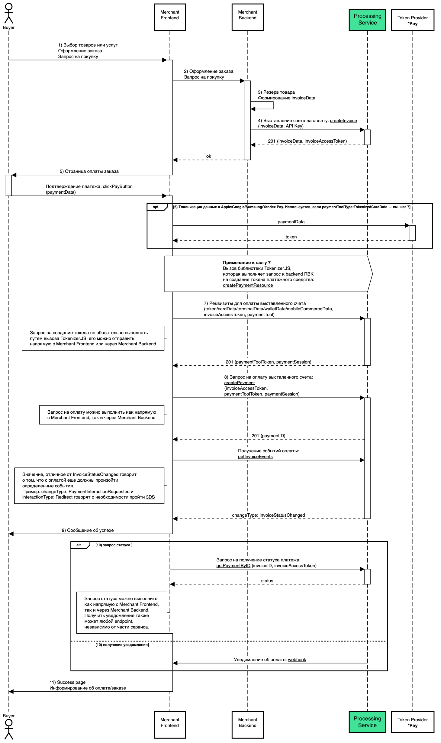 В случае, когда оплата производится с платежной формы “Процессинговый сервис”, последовательность взаимодействия с платформой выглядит так: